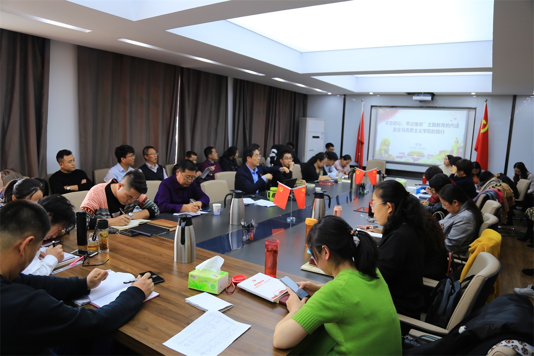 10月28日下午,在BEAT365英国官网507会议室,党总支书记贺瑞以“不忘初心、牢记使命主题教育的内涵及在BEAT365英国官网的践行”为题,为学院师生讲授“不忘初心、牢记使命”主题教育专题党课。校第五主题教育指导组周绍渊同志到会指导。