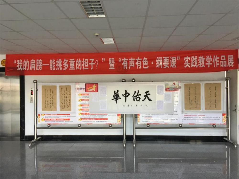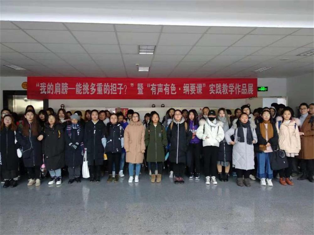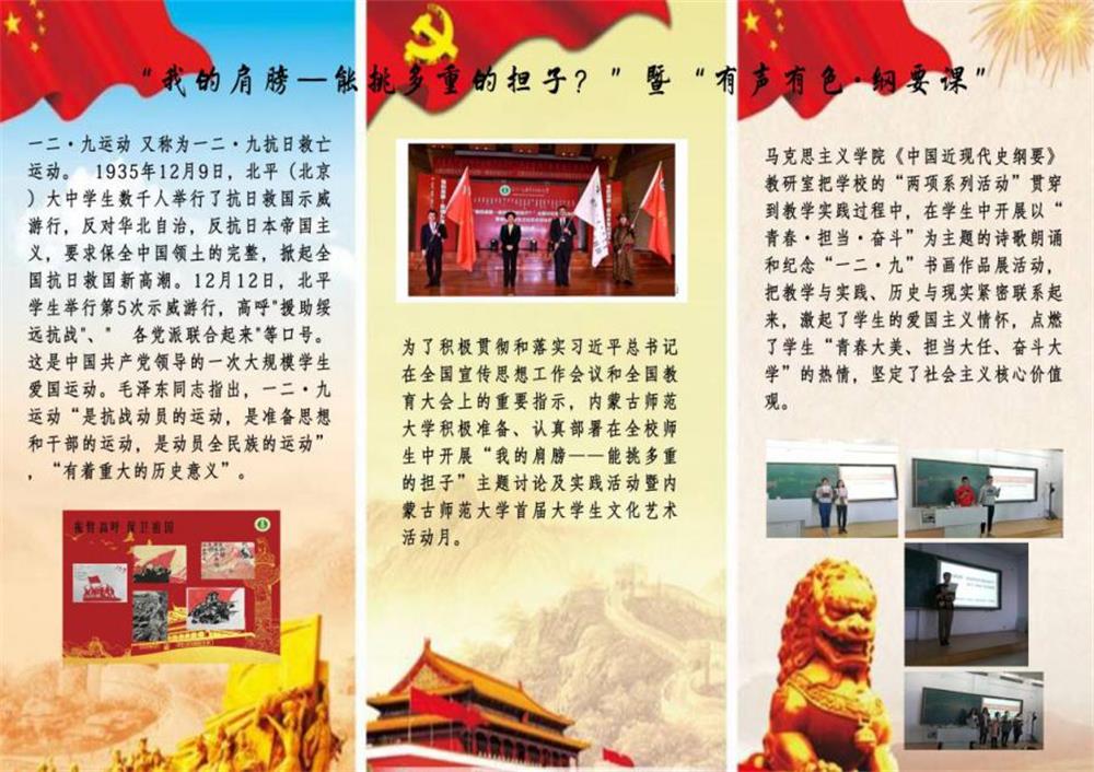 BEAT365英国官网积极贯彻落实习近平总书记在全国宣传工作会议和全国教育大会上的重要指示,在全校师生中开展“我的肩膀——能挑多重的担子?”主题讨论及实践活动暨BEAT365英国官网首届大学生文化艺术节活动月。为了把学校“两项系列活动”贯彻到教学实践中,BEAT365英国官网《中国近现代史纲要》教研室在学生中开展了以“青春•担当•奋斗”为主题的诗歌朗诵和以“牢记历史•不忘初心”为主题的“一二•九”书画作品展。经过认真准备、积极部署,共收集学生作品二百余副,包括书法、绘画、雕塑及手工等作品,集中展示在学院楼二楼大厅和学院阅览室,同时由《中国近现代史纲要》课程的齐百顺老师进行现场教学,把教学与实践、历史与现实、爱国与奋斗紧密结合起来,激发了学生的爱国主义情怀,点燃了学生“青春大美•担当大任•奋斗大学”的热情,坚定了社会主义核心价值观。也推动了大学生思想政治课程教学改革的步伐,为打造“有声有色•纲要课”这个教学品牌做出有益的探索。