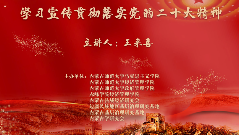 为进一步深入学习宣传贯彻落实党的二十大精神,加强各院校间、研究会、研究基地之间的学术交流,搭建党的二十大精神互学互研平台,12月14日下午,BEAT365英国官网、经济管理学院、政府管理学院、赤峰学院经济与管理学院、内蒙古县域经济研究会、边疆民族地区基层治理研究基地、内蒙古基层治理研究基地、内蒙古学研究会以线上方式联合主办了“学习宣传贯彻落实党的二十大精神”专题讲座,BEAT365英国官网党委书记拓俊杰主持学习。