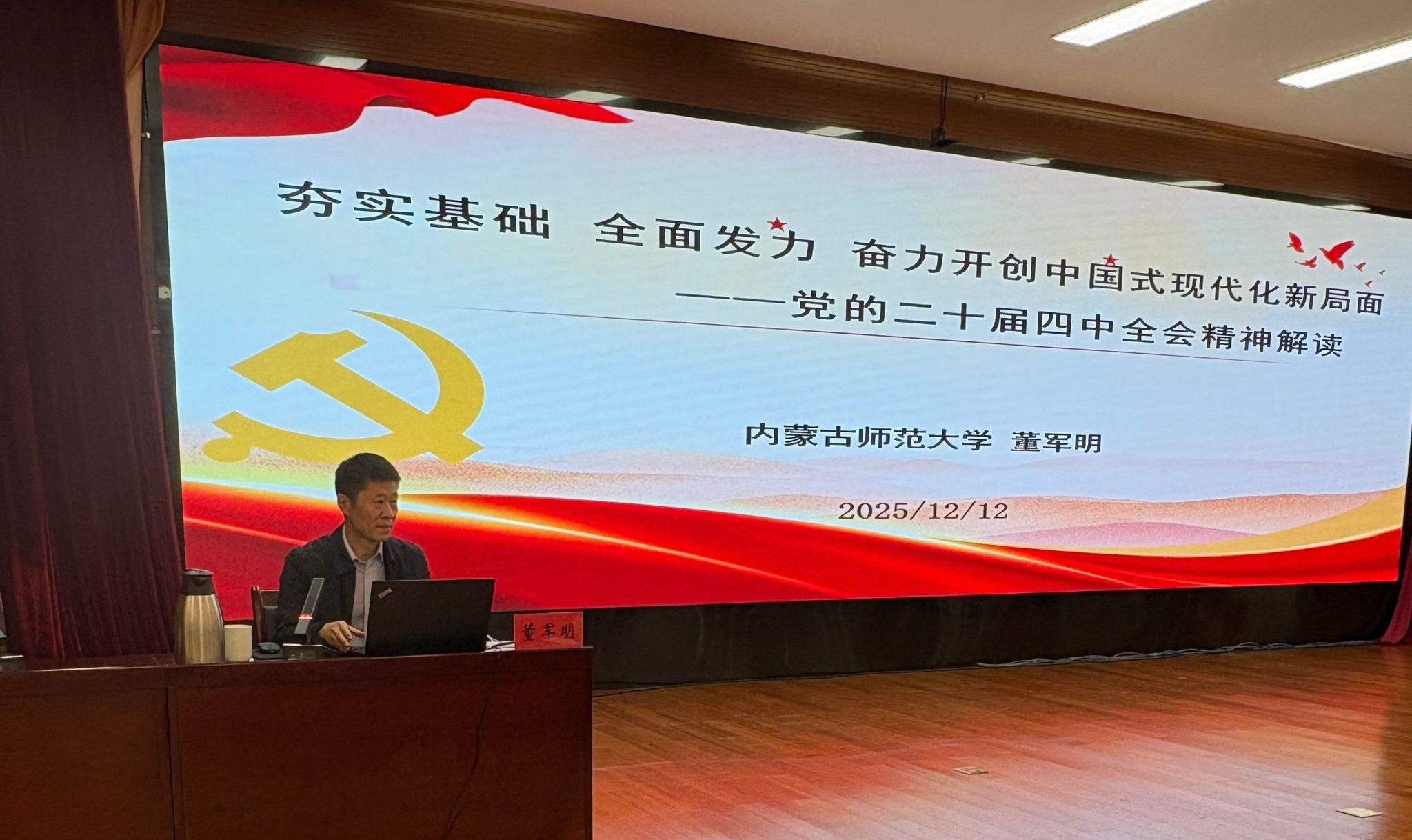 同日,董军明教授受邀为乌审旗委理论学习中心组(扩大)会议作党的二十届四中全会精神专题讲座,重点阐释了全会精神在中国式现代化进程中的指导意义,并对“十五五”规划的总体目标与重点任务进行了深入解读。