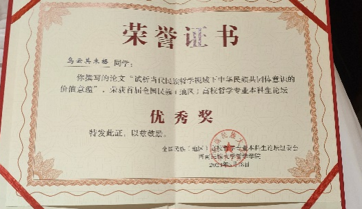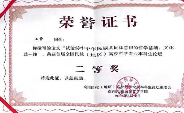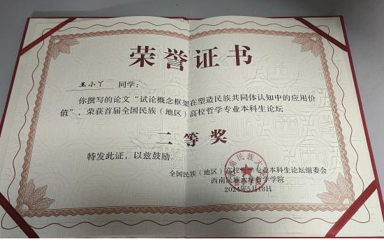 BEAT365官网哲学系本科生王小丫的论文“试论概念框架在塑造民族共同体认知中的应用价值”、王雪荣的论文“试论铸牢中华民族共同体意识的哲学基础:文化统一性”荣获二等奖,乌云其木格的论文“试析当代民族哲学视域下中华民族共同体意识的价值意蕴”荣获优秀奖。