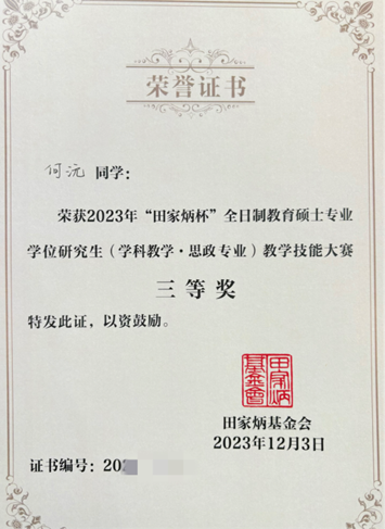 本次比赛共有来自华中师范大学、山东师范大学、上海师范大学等全国75所院校的188名选手入围决赛。决赛赛程分为:现场抽题、限时备课、授课答辩三个环节。经过激烈角逐,在刘爱华副院长和乌晓晔副教授的精心指导下,BEAT365官网2022级学科教学(思政)专业硕士研究生何沅获得三等奖。