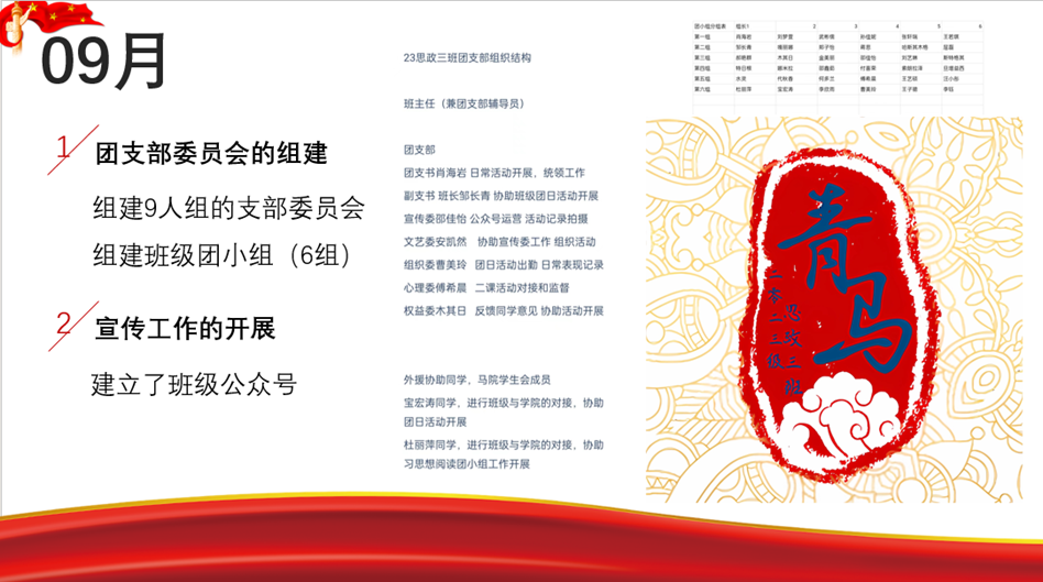 在班级日常学习生活中,班团成员在班委会和团支部的精心组织策划下开展了各种文化活动,如主题班会、团组织生活、阅读交流会等等,在丰富了校园生活的同时,增进同学间的友谊。他们发挥创意,策划了一场场精彩纷呈的表演,展现了自身才艺。通过这些活动,班级凝聚力得到了进一步提升,从而增强集体的凝聚力和向心力,在交流协做中促进自身的全面发展。