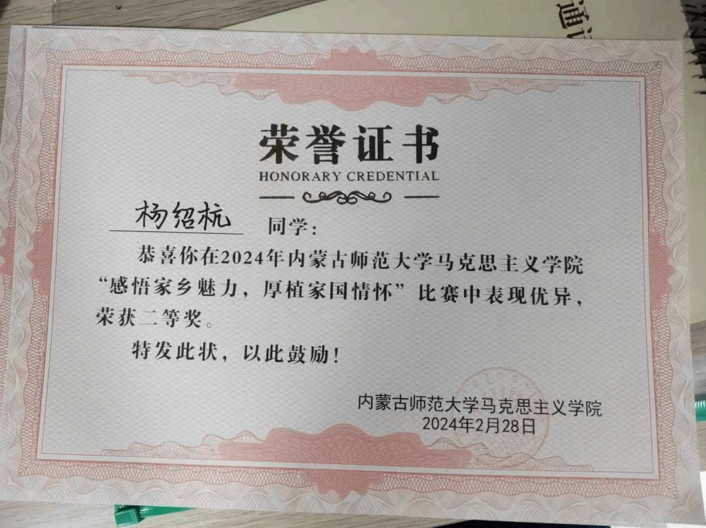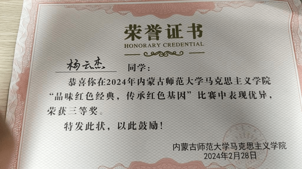 我班杨云杰同学在BEAT365英国官网“品味红色经典,传承红色基因”比赛中获得三等奖,杨绍杭同学获得二等奖。